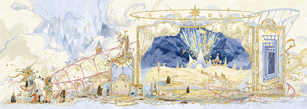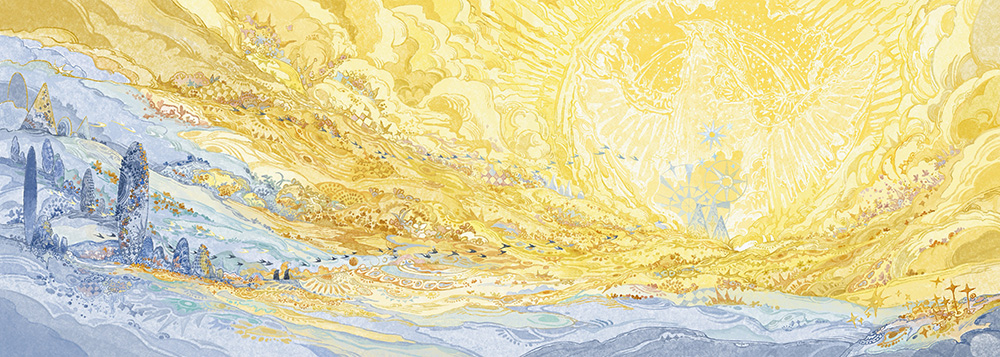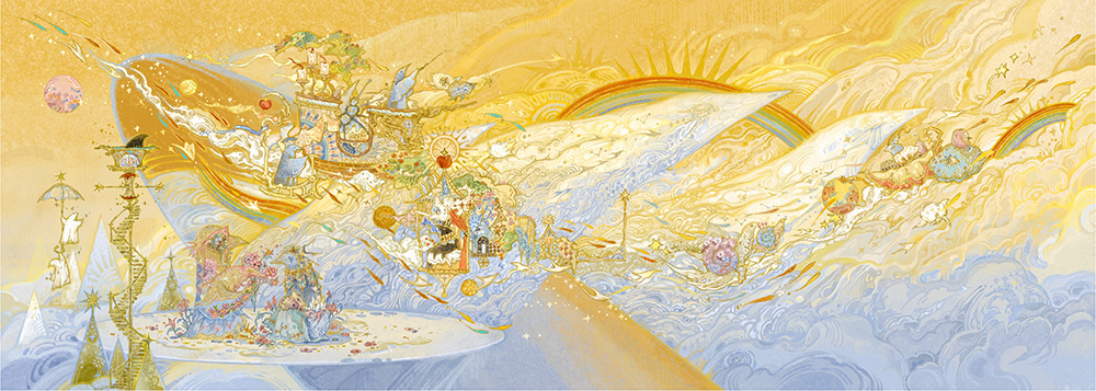 審査員評I think the word "infinity" best suits the works of Yunshu Yang. Perhaps this is how the worlds up there, somewhere beyond the clouds, flooded with sunlight, should look. But man is not destined to see it like this. Perhaps only in a dream, through Yingshu Yang's illustrations, or from an airplane at dawn... Birds are another matter... Do those worlds ever slow down to rest? The endless celebration of life is what appears to be in every composition. Life in motion, whenever it is day or night. Ekaterina Borodacheva I'm impressed by Yang's great imagination and the richness of elements and colors in this series. She utilized curved compositions to give it a very lively and dynamic vibe, which makes me feel like I can’t wait to step into the world of these paintings—to breathe the air and take a closer look at what’s happening there. Max Liu This work is strikingly eye-catching, with its use of color creating a visually splendid, almost gilded effect. The dominant yellow and blue tones highlight the main subject while also helping to define the spatial composition. The elongated format further enhances the immersive quality of the scene, making viewers feel as if they are part of the world within the artwork. Moon Q Yunshu Yang’s project unfolds as a visually dense and structurally controlled exploration of transformation and recurrence. Layered details verge on abstraction, but remain tethered to a symbolic logic that rewards prolonged viewing. The compositions evoke theatrical, cosmic, and organic systems—held together by a consistent rhythm of visual motifs. The use of watercolor textures and carefully modulated color temperature builds a dreamlike continuity across the series. This is a deeply ambitious work that constructs not just images, but an entire cosmology through illustration. Nadiia Zhelieznova The author creates an illusory fairyland in the clouds, employing grand compositions and bright colours. Her works not only achieve a breakthrough in visual expression, but also refine and transform the metaphysical thinking about the transcendental world, the dimension of space and time, and the proposition of life and death. Through a unique artistic language, Yunshu constructs a spiritual field on picture planes where philosophy and art are intertwined. This creative practice blurs the boundaries between art and philosophy, leading the viewer to embark on a journey of discernment about the nature of existence in the aesthetic experience. Yimin Wang |