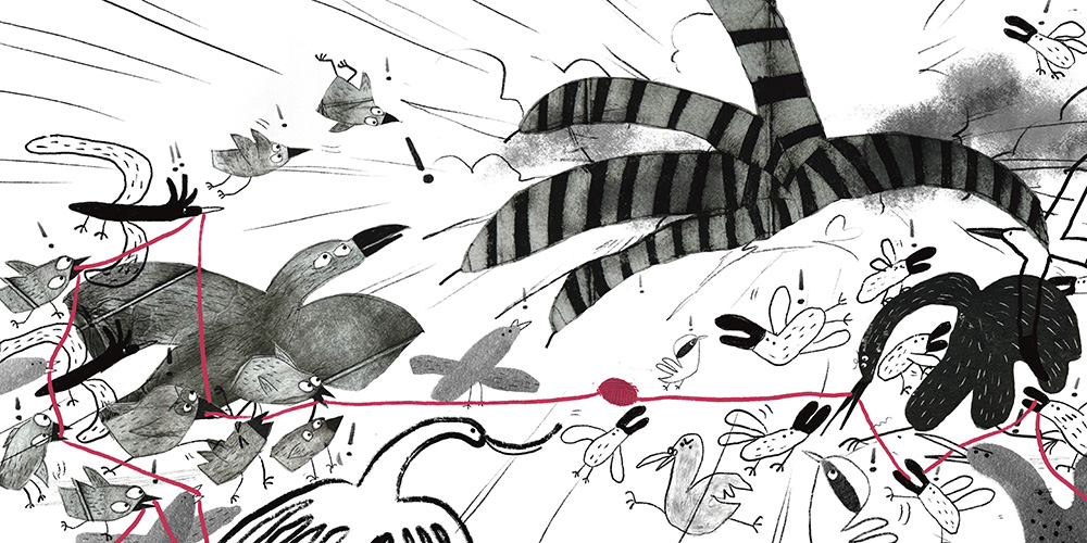 Judges' commentsWhat a wonderful graphic story! Despite the conventionality of the forms, each character is unique, emotional, and has its own nature. For me, this series of illustrations by Qinzi is like a breath of fresh air. I especially liked the lightness, humor, thoughtful compositional solutions, and professional work with color accents. Ekaterina Borodacheva Clean, readable, and nicely dynamic compositions. I like how Qinzi illustrated the birds in a stylized way—full of character and energy. It might help to pay more attention to the overall form and bird placement, maybe group them more or push the big-medium-small hierarchy. Also, I love the textures on the birds—would be great to see some of that carried into the backgrounds, which feel a bit empty right now. Max Liu The birds are rendered in black and white, naturally drawing the viewer’s attention to the red ball of yarn — which also guides the flow of the story. The birds’ expressions are vivid and playful, and the treatment of textures is both creative and distinctive. Moon Q A lively and humorous visual narrative. The composition is dynamic and expressive, with great rhythm and interaction between the characters. The red thread works excellently as a visual anchor across the spreads, guiding the viewer’s eye and unifying the story. The mix of techniques creates rich textures while keeping the overall look cohesive. Nadiia Zhelieznova The artist uses printmaking to preserve the unique marks left by the printing process as part of the picture's texture, and the reconstruction and remodelling process through collage is very distinctive. Additionally, the bird's expression is rich, and the black-and-white colour scheme evokes the silent comedies of Chaplin. Despite the absence of sound, the witty and humorous atmosphere and childlike fun conveyed in the picture are palpable. Yimin Wang |