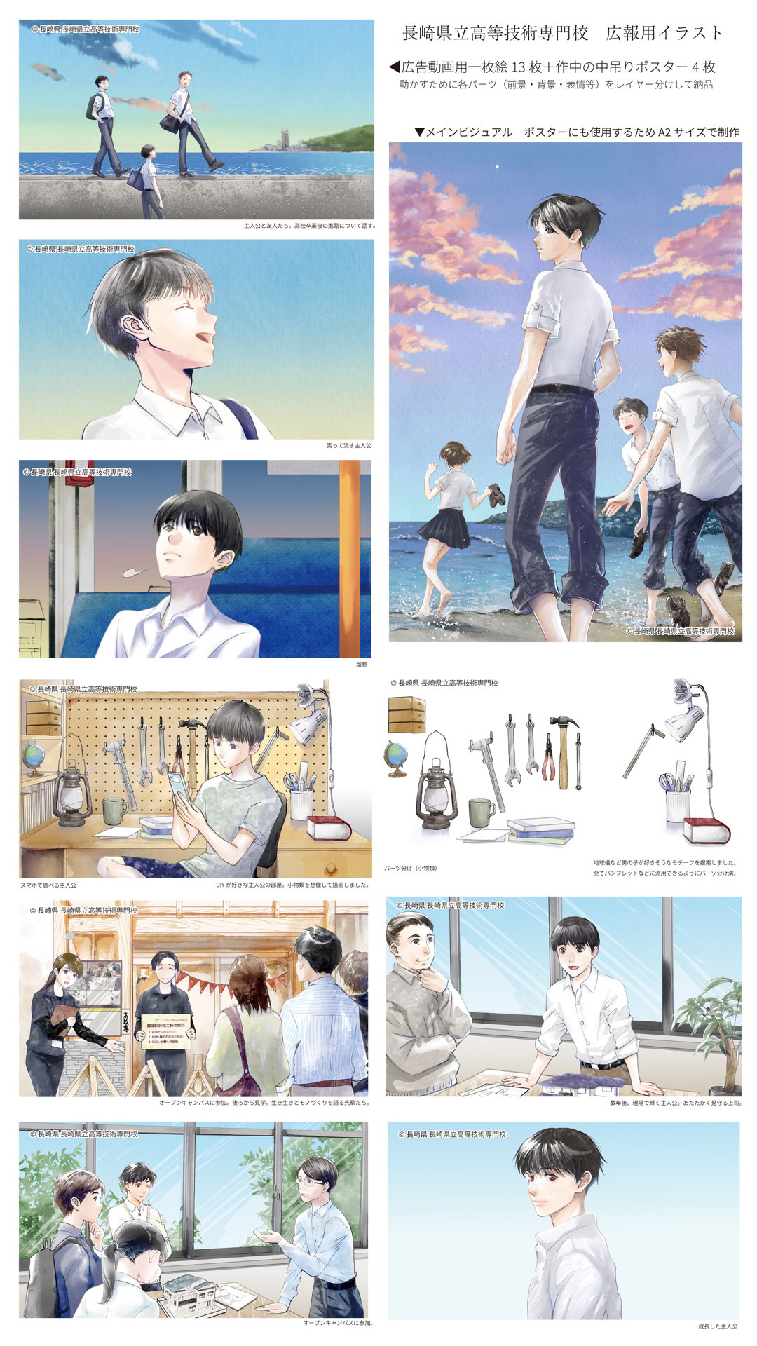 The name of the client長崎県 The media in which the illustration usedYouTube広告 https://www.youtube.com/watch?v=q7_NX-YdKog Artist's comments長崎県からのご依頼で長崎県立高等技術専門校の紹介ムービーのイラストとチラシ・ポスター等イラストを制作させていただきました。 At the request of Nagasaki Prefecture, we created illustrations for an introductory video for Nagasaki Prefectural Technical College, as well as flyers, posters, etc. |