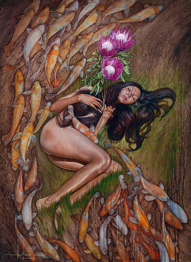 審査員評Hari's depiction of textures in the paintings is truly astonishing. The intricate details leave me in awe, showcasing an incredible level of craftsmanship and precision. Every element, from the smallest highlights to the most subtle shadows, is rendered with such meticulous. Van Li Exhibiting a highly consistent style and well-developed storytelling, the artwork demonstrates incredible oil painting skills. The visual elements are skillfully employed to interpret the nuanced relationship between humans and nature, creating a powerful and evocative representation. Haimeng Cao The intricate use of symbolism in Hari's illustrations conveys deep emotions. The realistic rendering of figures juxtaposed with fantastical elements, such as the koi fish and the rhinoceros, creates a compelling narrative. Hari’s ability to paint with her heart is palpable, leaving a lasting impression. Rita Yuwei Li Her mastery of realism and her symbolism expresses with clarity and strength, both her commitment to the growth of her soul, and to bring that value to art. Such refined details require depth of life, and Hari embellishes her path of power very well, with the dignity and strength that corresponds. It is no coincidence that she use golden tones, that also enhances the feeling of something valuable, while she expands her symbols with gestures of openings, darkness and shelters of nature. Magnificent and wild artist. Lucas León Stunning realistic artworks. Very beautifully and intricately detailed portrayal. I particularly enjoy the use of gold in the artworks, which highlights the subject while also exuding a sense of luxury. PINGNAN LU |