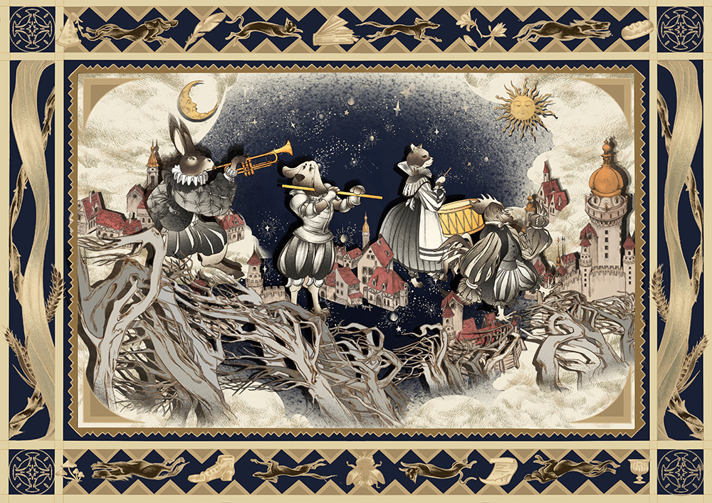 審査員評Chumeng's art brings me such a nostalgic and graceful vibe. The fairytale scenes and the classic vintage frame design are dreamy. Each piece evokes a sense of wistfulness and elegance, transporting the viewer to a magical, bygone era. The delicate details and whimsical elements create an enchanting atmosphere that feels both timeless and ethereal. Van Li The details in each illustration effectively enhance the visual storytelling. The design of the animal musicians, their costumes, the food, and the town all work together to create a unique world for the audience to immerse themselves in. Haimeng Cao The cutout style of this illustration fits the British fairy tale theme perfectly! The elements are playful, having a charming fairy tale mood. The whimsical and imaginative style enhances the narrative, making it visually delightful. Rita Yuwei Li It reminds me of small medieval puppet theatres, but here the characters take their relevance through the raised collage style, which works beautifully. The medieval setting, the costumes, everything forms a very coherent and well-crafted aesthetic melody. It is a spectacular rebellion towards freedom, an anarchic dance full of life and creativity. Lucas León Very cute character designs and story setting, with lively character dynamics. The animal costume designs in the painting, along with the illustrations on the margin, give me a feeling of a medieval manuscript. PINGNAN LU |