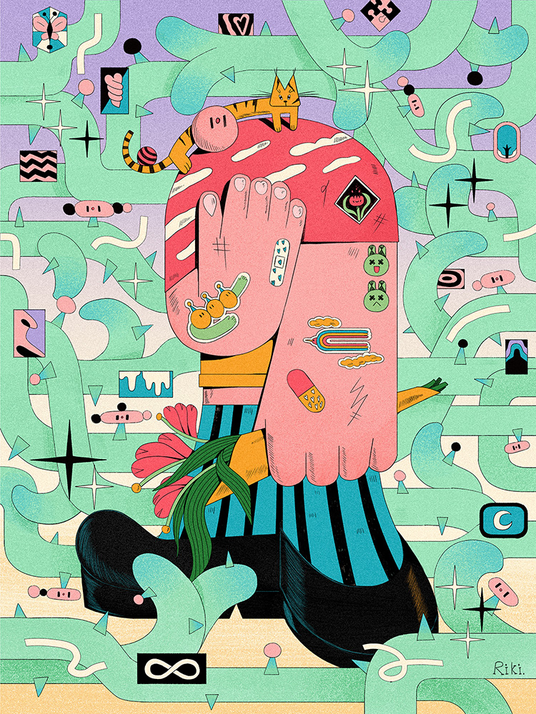 審査員評Riki's art is so much fun to look at. The intentionally broken backgrounds and all the graphic elements bring a whimsical vibe. The color palettes are playful and vibrant, adding to the overall sense of joy and creativity. Each piece feels like a delightful visual adventure, with unexpected details and lively compositions that keep the viewer engaged. Van Li The character design is highly symbolic and memorable, with each image utilizing a distinct color tone to express different moods that reflect experiences in life. Haimeng Cao The color pops out and there are so much fun little elemnts in each illustration. The way Riki express both the good and the bad moments in a graphic way is really compelling and fun to look at. Rita Yuwei Li An impeccable line work, a modern and playful color palette. He/she/x has a style with a good taste for fashion, and his/her/x characters are achievements of his/her/x identity as an artist, the are very versatile and groovy. Riki is stylish, and he/she/x knows it, because he/she/x plays very well with it. Lucas León Amazing graphic style, with very mature and beautiful shape design. The character designs are very unique and cute. Great works! PINGNAN LU |