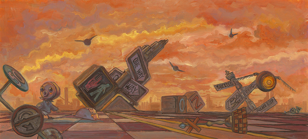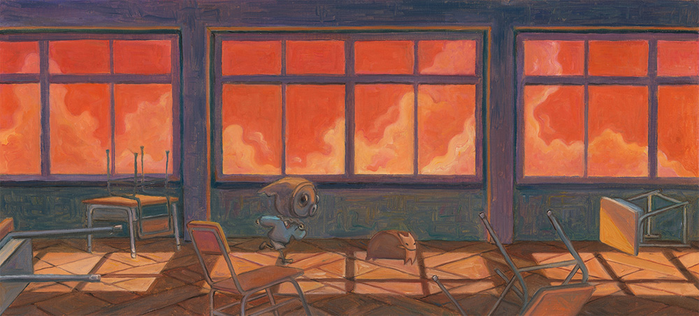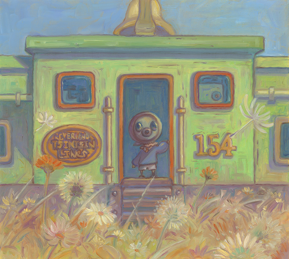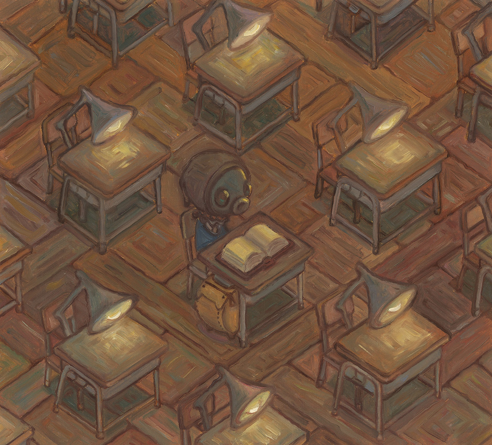 used art supplies or application softOil on paper Artist's commentsThese illustrations are from my picture book "Rules of Square", illustrating a masked kid called Work Harder who complies with all the rules, until a school bag dog, Packy, ate his life dictionary, an unprecedented thought crossed his mind: leaving the world of norms. They finally found their Utopia through a midnight toy train. This book is a tribute to those who remain true to themselves. |