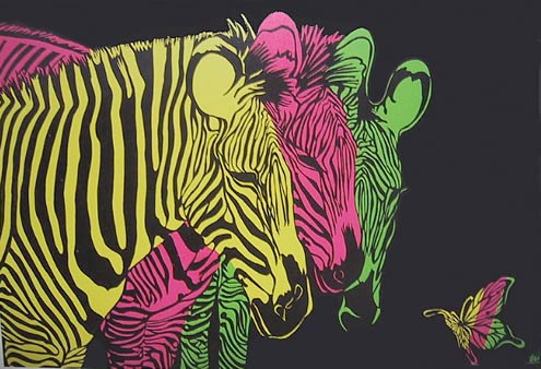 切り絵です。シマウマのしま模様や蝶の羽根の模様が切り絵としてうまくマッチしています。