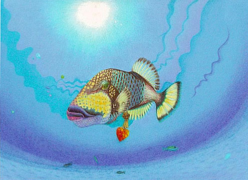 いつもながら色鉛筆で描かれているとは思えない深みのある色を出していて感心します。タイトルの「勝負」は何を勝負するのでしょうか? 胸びれにピアスをしていますが、いまいちその意味が分かりづらいです。もう少しコミカルに遊んでみても面白いかも知れません。 蟹江 隆広 |