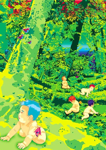 森の描き方が独特で面白い。あかちゃんの描き方も独特で面白いが、森の描き方と違うので、森の中で浮いている。意図してやっていると思うが、その意図が良くわからない。