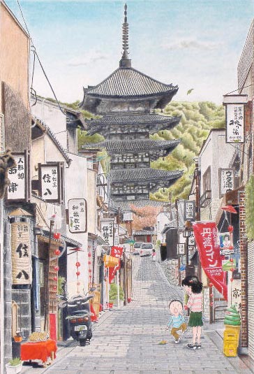 日本の懐かしい風景を優しい色使いで丁寧に描いてある。手描きの暖かさが感じられ、見る人ょホッとさせる作品。