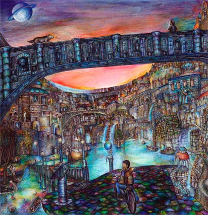 「樹海のような果てしない"あの森"をぬけた瞬間、僕は思わず息を呑んだ。そして呆然と立ち尽くした。僕の眼前に広がっていたのは森に隠された巨大な町だった。それはすさまじいほどの超常的光景だった。大自然と人間とが完璧に共生した圧倒的な究極の美、街の入り口にある看板には"City of Cascade"と書かれていた。」 イラストに添付されていたコメントを紹介してみました。 まず第一印象が「頑張ってよく描き込んだな」というのと、色使いが独特で個性的ということです。 画面は全体的に暗くて、細部が分かりづらいのが惜しいです。 色もちょっと細かく分け過ぎかも。 世界観は独特で面白いと思います。 蟹江 隆広 |