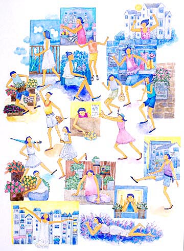 日常のワンシーンを切り取ったカットの組み合わせで、人物に動きが感じられ、楽しそうなイラストになっています。