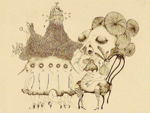 異常に細長い鼻、食べようとしているのは他者の髪で、フォークと思ったら、フォーク自体が髪に変型している。