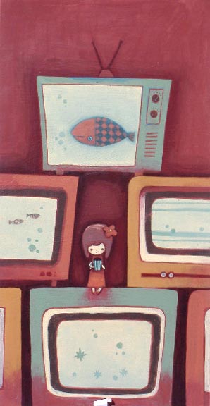 落ち着いた色調、人物を中央に小さく配置した構図、立体感をほとんど無視したような形、個性的で作家性がある。