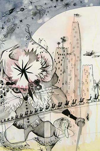 自由闊達なペンの線描が味わい深く素晴らしいです。 木馬に跨ったシルエットの行進、猫の衣装のレース飾りなど綺麗で素敵です。 大橋 紀子 |