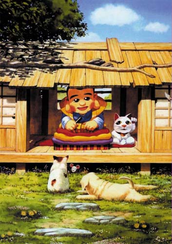 あばら家に住む巨大な福助と招き猫。