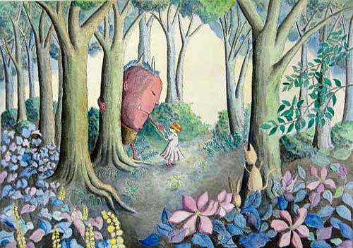 鬼の顔をした妖怪(?)と女の子、それを見守る動物達、今後どんな展開になるのか気になる。