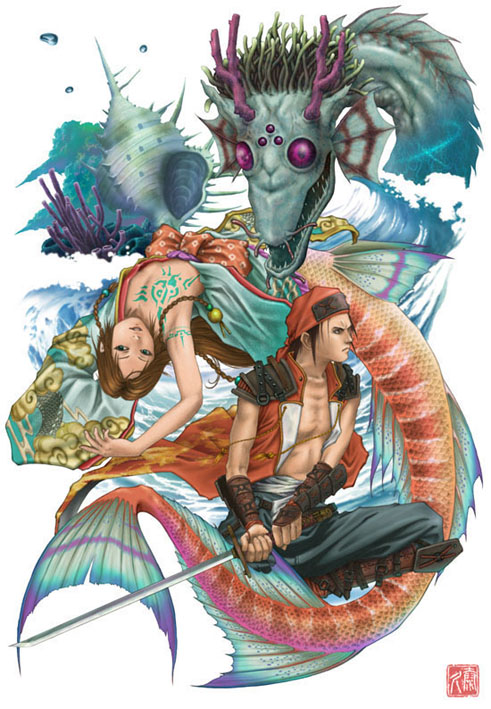 海の怪獣と人魚、怪獣に立ち向かう若者、物語を感じさせる。