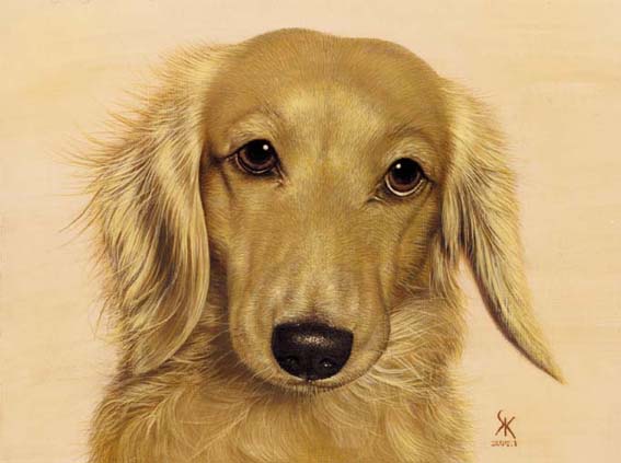 毛並みを細密に描かれた犬の肖像は、鳴声をあげるかのようにリアル。