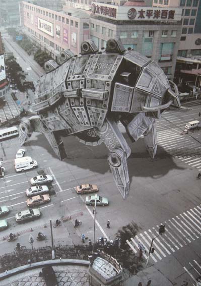 立体作品と実写の合成、メタリックな怪獣が背景にとけ込みすぎたのが残念。