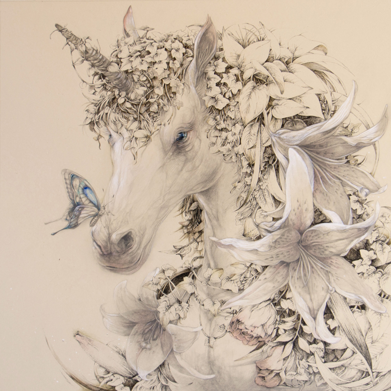 審査員評完成度があります。 大西信之(画家) 生を感じる仔馬、死を連想させる老馬、ともに繊細なタッチで表現力の豊かさを感じます。 ただ、角は老馬のほうが精力的に見えるのは作者の意図するところでしょうか? 花のイメージも異なる見せ方があってよいかもしれません。 上島秀幸 (ブラス出版) 目の色に作者の表現したい意図を感じます。 溝口真一(株式会社 ビットウィン 所長) ユニコーンのもつ花のイメージが、細密な表現方法でうまく演出できた作品と感じました。 長尾洋平 (RoughStone 代表) 鉛筆画で色は極力抑えてありますが、アートとしてのクオリティーが高く、魅力がある作品です。 蟹江隆広(日本イラストレーター協会 会長) |