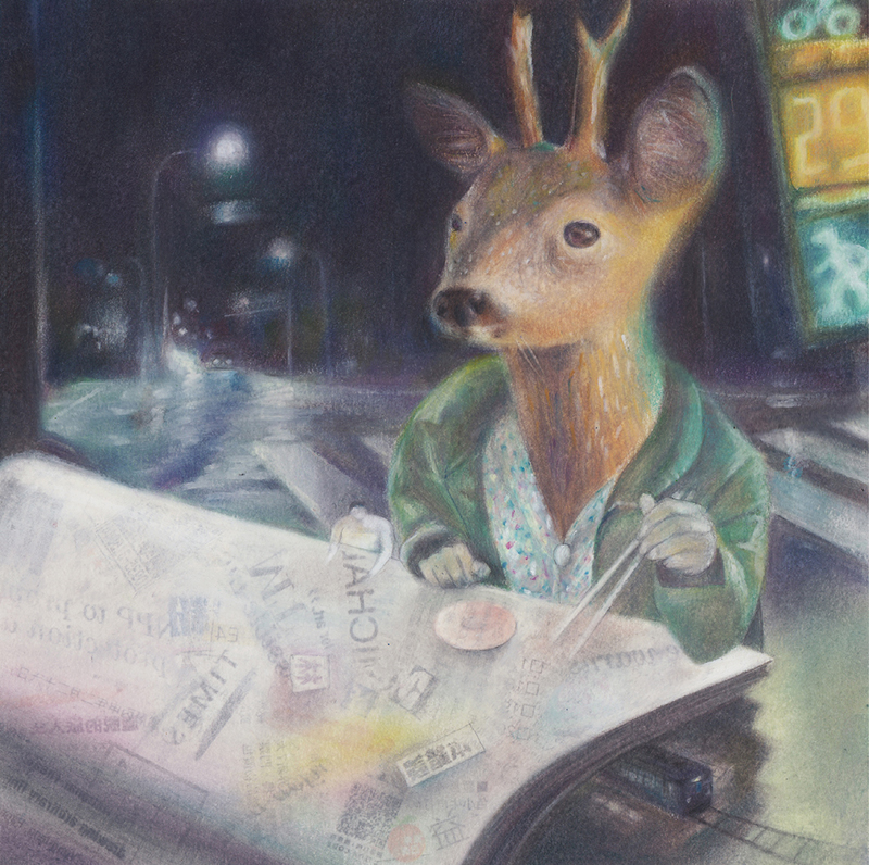 審査員評マグリットのようで面白いです。 大西信之(画家) 身近な日常の1シーンの中にも独特の世界観が表現された作品だと思います。ほのぼのとした温かさのある色使いと動物たちの描写がうまくマッチングしていると思います。 上島秀幸 (ブラス出版) 題材は非常に面白く、独特の世界に挑戦していると思います。 溝口真一(株式会社 ビットウィン 所長) 擬人化された動物達が巨大で(もしくは人が小さいのか)、人と動物が入れ替わったパラレルワールドとして楽しませていただきました。 長尾洋平 (RoughStone 代表) 台湾の作家です。 蟹江隆広(日本イラストレーター協会 会長) |