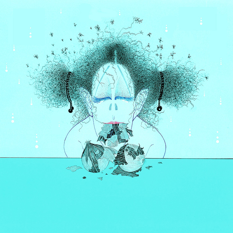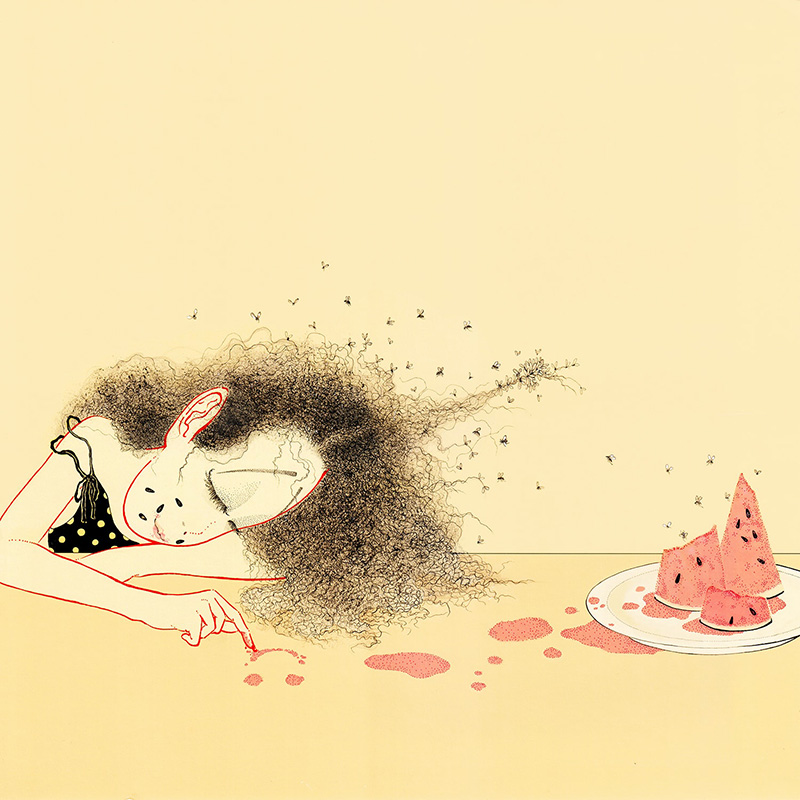 審査員評このインパクトは強烈だった。衝撃度でいったらトップの作品だ。一度見たら忘れられない。 小林正直(二科会デザイン部会員) 今年の猛暑のような、うだるような熱気と腐臭と倦怠感が伝わってきます。 田中淑恵(ブックデザイナー) 極細のワイヤーの束を捏ね回したようなヘアースタイルが印象深いイラストです。 増本大二郎(二科会デザイン部会友) 独自のキャラクターが確立していて、個性がはっきりとした作風。 山本さと子 (版画家) キャラクターが非常に個性的でインパクトが強いです。 蟹江隆広(日本イラストレーター協会 会長) |