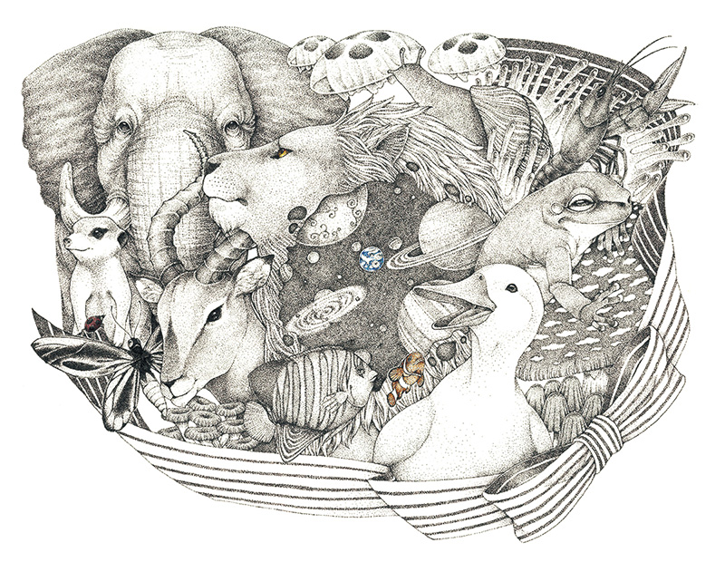審査員評点描と線描で作品を制作されているようだが、表現の抑揚を感じないので、もし点描でしんどくなるようだったら、ペイントにしたほうがいいと思う。 小林正直(二科会デザイン部会員) 中心に天体を描くことで、食物連鎖も悠久の時の流れの一環だということを思わせます。 田中淑恵(ブックデザイナー) 判り易い具象の事物を丹念に描き込みながらスポットを当てるように作家としての主張をグイと食い込ませる意志の強さが凡庸となる危険を回避させ非凡な世界を生みました。 増本大二郎(二科会デザイン部会友) パペットのキャラクターの表情と、動物のリアルな表情、手描き技術の高さが伺える作風です。 山本さと子 (版画家) 点描は非常に根気が必要な作業です。 蟹江隆広(日本イラストレーター協会 会長) |