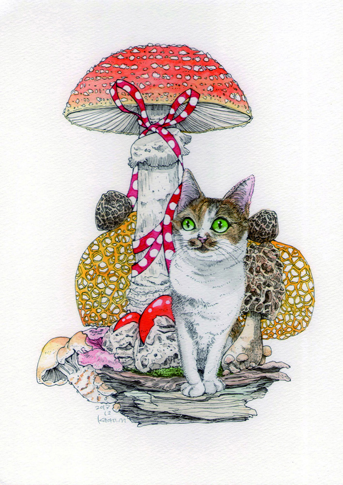 used art supplies or application soft線:コピックマルチライナー Artist comments1はうさぎときのこ、2はねこときのこ、ともに組み合わせは可愛いアイテムを選んでいますが、きのこはほぼ毒キノコを使用しており1においてはスカルや脳みそも描き込み「可愛さの中に潜んでいる怖さ」を表現してみました。 |