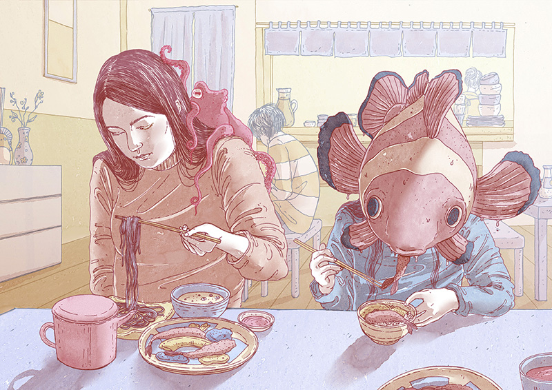 審査員評I love the storytelling in Elena’s work!! Hannah Li Miss Clownfish is a microcosm of many people, who enjoy peaceful life. Ailun Jiang I like the story. Belle Lee I love the colors of this illustrations. Fatinha Ramos 人の頭が熱帯魚になっている。 蟹江隆広 |