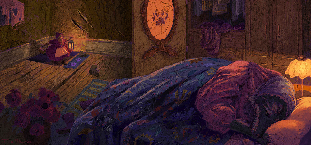 審査員評Juitzu's paintings feature colors that are both classical and elegant, creating a timeless and refined aesthetic. The character expressions are incredibly lifelike, capturing subtle emotions with remarkable precision. Juitzu's ability to capture motion is truly amazing, bringing dynamic scenes to life with fluidity and grace. Van Li The beautiful composition and use of color in each image create a strong cinematic experience. This artwork could serve as an excellent visual development piece for an animated film. Haimeng Cao Juitzu uses digital techniques to create an analog oil pastel effect, adding a unique texture to her work. Her dynamic composition brings a fresh, darker perspective to the classic tale of Little Red Riding Hood, making it more engaging. Rita Yuwei Li I love the decision of the horizontal format, because it highlights Juitzu's great compositional talent. Perspectives and aesthetics that are endearing, and at the same time, have some bizarre gestures, both in colors and angle mismatches. From the happiest colors, to the black of death. A very good choice of textures that create a childlike feeling, with a great mastery of light and shadows varying their color palettes, it is delightful to look at. In addition, the daring to transform classic stories, giving them their own vision, to break their illusions and say something that is considered more authentic, is always valuable. Lucas León This is an excellent reimagining of classic fairy tales. The narrative in the work is very strong, and the textures are also very beautiful. Because I personally enjoy dark fairy tales, I quite like this ending. PINGNAN LU |
