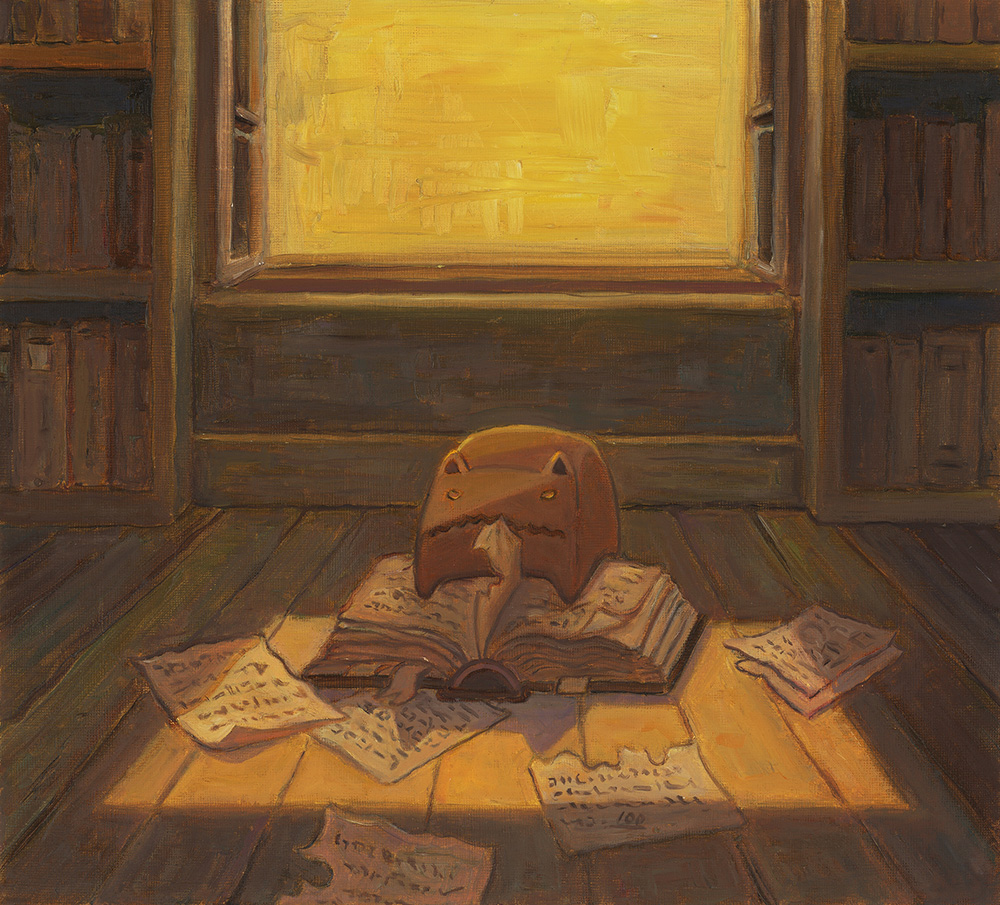 used art supplies or application softOil on paper Artist's commentsThese illustrations are from my picture book "Rules of Square", illustrating a masked kid called Work Harder who complies with all the rules, until a school bag dog, Packy, ate his life dictionary, an unprecedented thought crossed his mind: leaving the world of norms. They finally found their Utopia through a midnight toy train. This book is a tribute to those who remain true to themselves. |