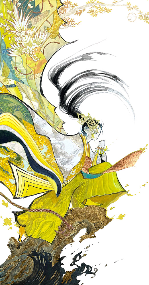 used art supplies or application softPoster color, Acryl gouache, Indian ink Artist's commentsIt's a stage about a girl travels through time and space. She opens the folk story. Her honest feelings become costume fluttering anywhere. |