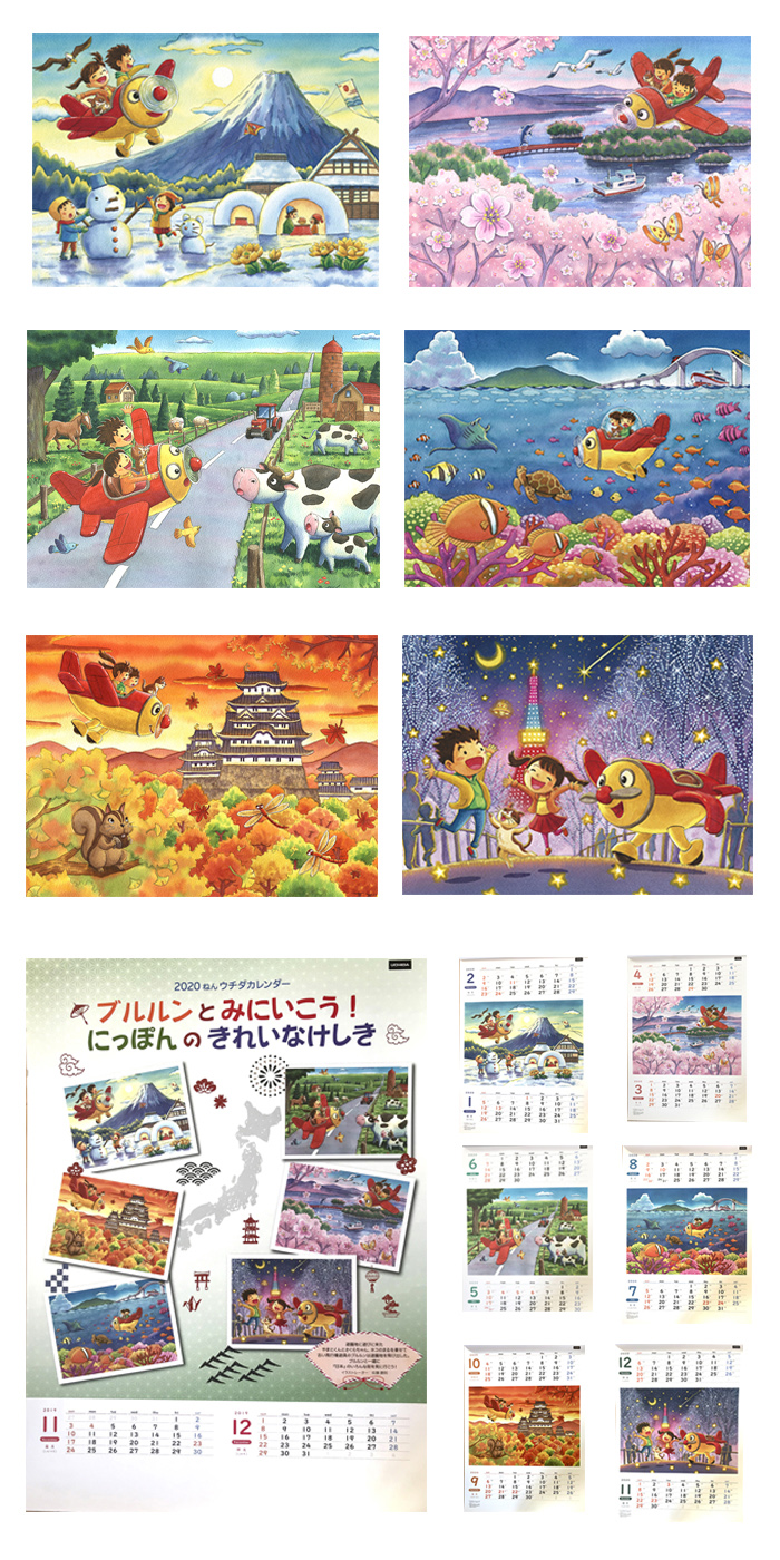 『ブルルンとみにいこう!にっぽんのきれいなけしき』とういうタイトルでイラストを描いた幼稚園、保育園向けのカレンダーです。