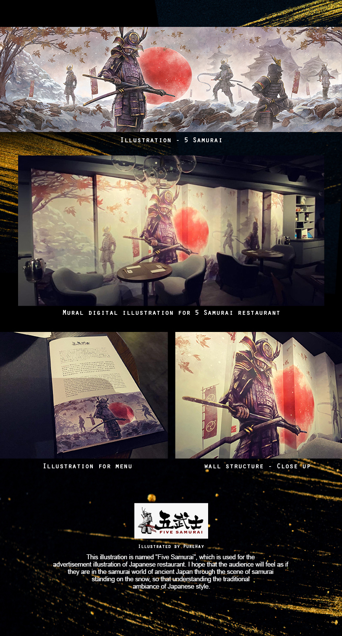 This illustration is named "Five Samurai", which is used for the advertisement illustration of Japanese restaurant.