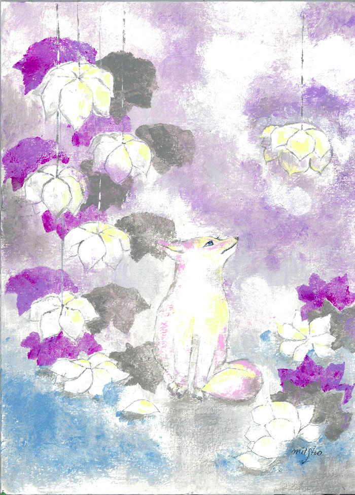 【作品に関するコメント】 クレヨンとアクリル絵具を使用し描きました。 最近日本画に興味があり、色の明暗や濃淡などを少し意識し、絵本のような雰囲気も出しました。 思い入れのある作品でしたので、購入して下さって嬉しく思っています。