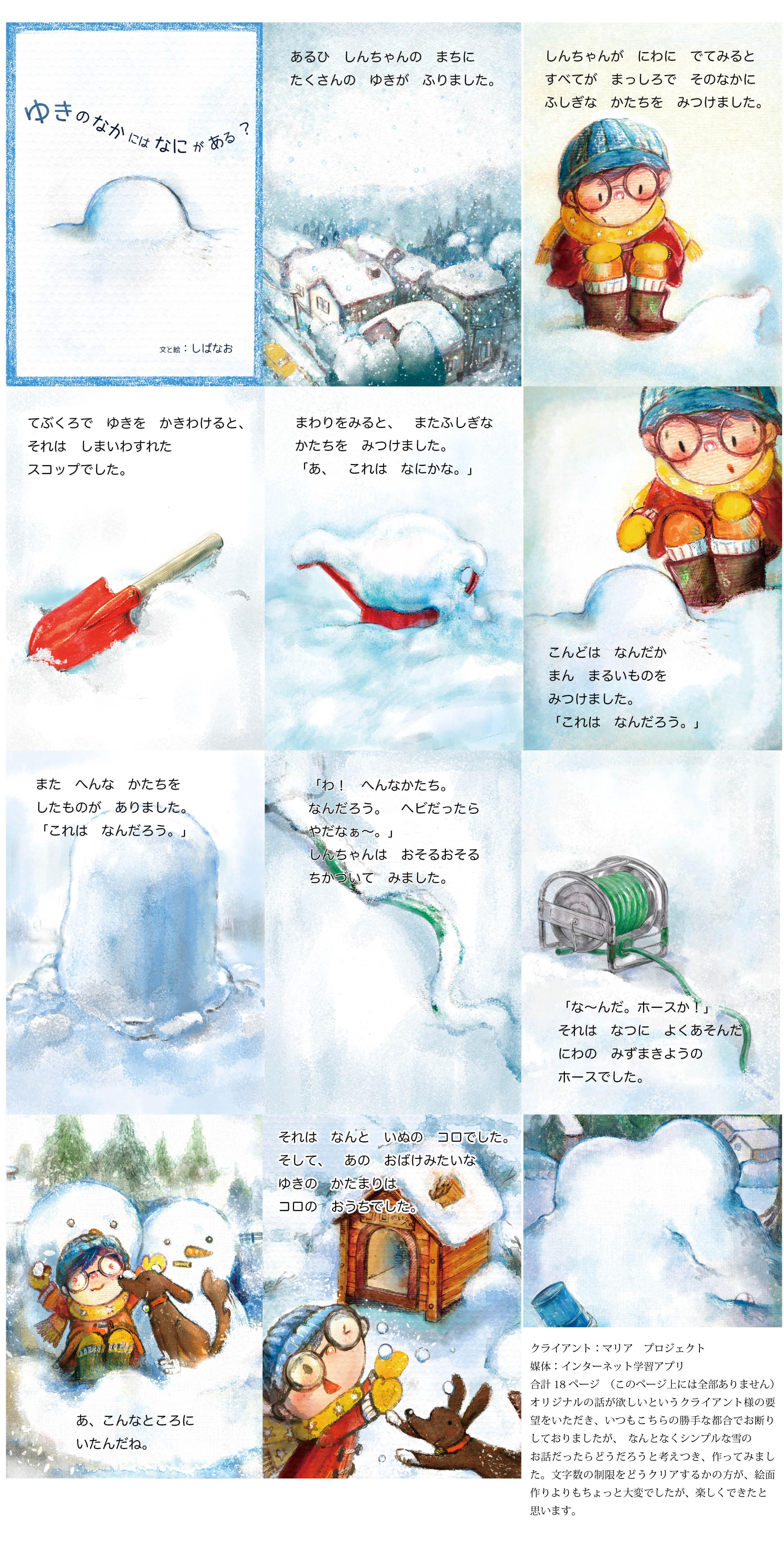 審査員コメント上月伸仁 多彩な表現で描き分けられた高い技術と感性で、絵にものを言わせ語らせられることが出来るイラストレーターとしての仕事ぶりを、今回のいくつもの素晴らしいエントリーから多く感じられました。また題字の作字まで、思わずお上手だなと、唸ってしまいます。 島谷祐子 同作家様からいくつか作品をノミネート頂いていましたが、この作品が一番ストーリーとイラストの世界観が合っていたと思います。アプリで閲覧される作品ですが、絵本のページをめくる楽しさも感じられる構成で、シンプルなストーリーは、お子さんが何度も読みたくなる作品だと思います。ご依頼に合わせてタッチを変えているということですが、このタッチの作品の、別シリーズを見てみたいと思うような作品でした。 内野僚子 雪のイラストがとても可愛い。質素な風景ですが、イラストの表現力が豊かで、子供達の想像力が膨らみそうです。人気のアプリ商品として販売されていることも評価の一つと致しました。 蟹江隆広 絵本形式のインターネット学習アプリですが、これ以外にも2冊出品されていて、どの作品のクオリティーも高いということで選ばれました。絵だけではなく、文もご自分で作られたことも評価されました。
