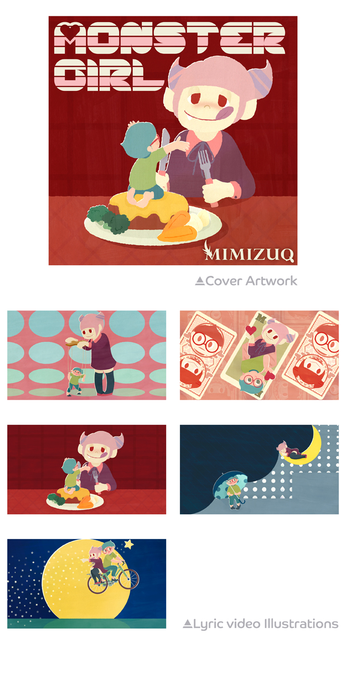 ヴィジュアル系音楽アーティスト MIMIZUQ の配信デジタルシングルのジャケット1点、そのリリックビデオの素材として5点のイラストレーション、あわせてタイトルロゴを担当いたしました。