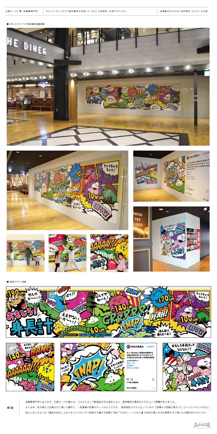 そんな中、私が個人で企画させて頂いた案件で、一見普通の写真スポットのようですが、 身長測定パネルになっていおり「記憶より記録に残そう!」というコンセプトのもと、他人と比べるよりも「過去の自分」と比べることで少しずつ成長する喜びを実感し“映え”ではない、いつもと違うSNSの楽しみ方を提供させて頂いた大型POPパネルです。