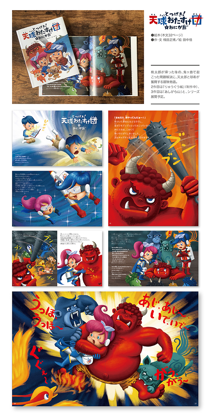 桃太郎が帰った後の鬼ヶ島を題材にした冒険物語で、子どもから大人まで楽しめるよう、可愛く楽しく、またインパクトのある絵を目指しました。