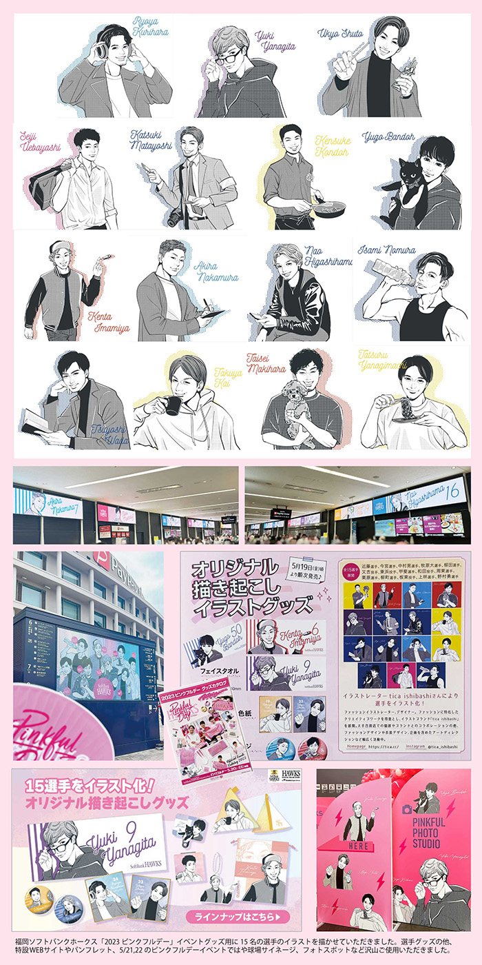 SNSではファンの方々の反響もあり、「ピンクフルデーの選手イラストをきっかけにこの選手が好きになりました」とホークスファンの方から直接メッセージをいただいたり、イラストレーターとして非常に嬉しく光栄で感慨深いお仕事となりました。