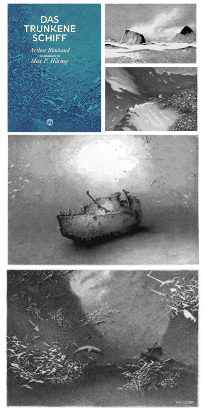 Illustrations to poem "Das trunkene Schiff" (The Drunken Boat)by Arthur Rimbaud a selection of 10 illustrations is published double-sided in this book. 16 years old Arthur Rimbaud wrote this fantastic imaginary poem in 1861.
