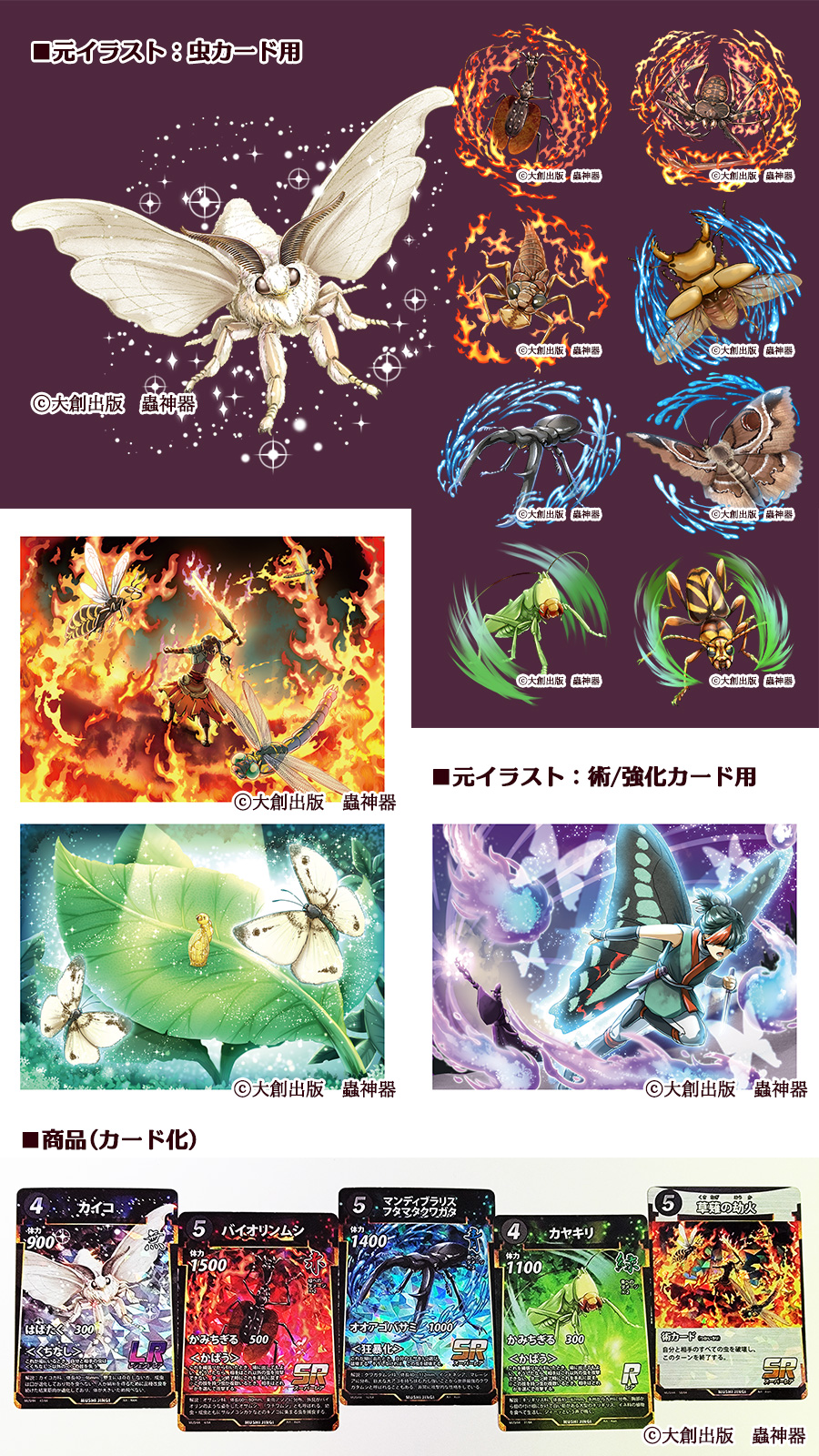 The name of the clientDaiso Publishing Co., Ltd. The media in which the illustration usedTrading card game "Mushi jingi" cards (insect cards/spell/strengthening cards) Artist's commentsI am working as an illustrator on Daiso's original trading card game, ダイソーオリジナルTCG「蟲神器」(2022/11~2025/1現在、ブースターパック第5弾まで展開)にて、イラストレーターとして携わらせていただいています。 |