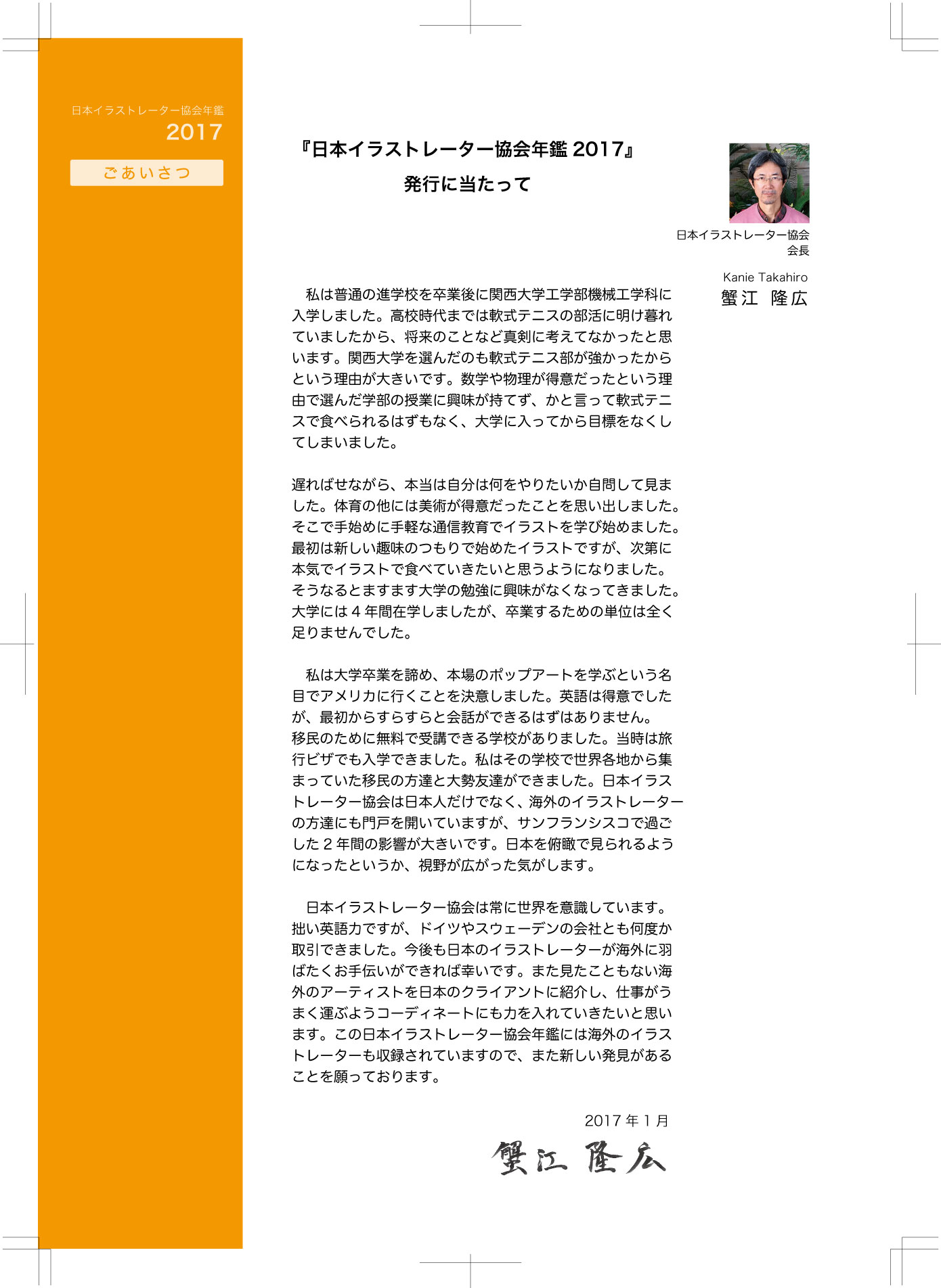 | 002 | 日本イラストレーター協会年鑑2017 発行に当たって | Message from the resident of JIA |