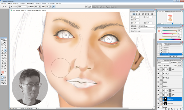 ・・・今回は、手描き専門のイラストレーターの松田ゆうが、実際にPhotoshopで試行錯誤し、活躍されているイラストレーターさんの助言を受けながらまとめたカリキュラムなので、